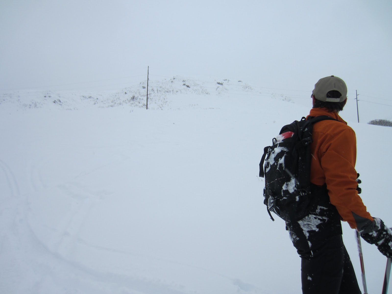 With the snow and white-out today, there would be no sweat fest. We skinned up the water tank trail and upon topping out on the rounded ridge at two-thirds height, through the mist we could see 20 or so eerily body-shaped shadows where there is normally just a grassy ridge. We wondered if we were hallucinating from the hypoxic pace, or maybe we were not where we thought, could we be on the neighboring, rocky ridge? A weird sensation to see things where there is normally nothing, but as we continued people emerged through the clouds as we ascended the ridge and we could hear one dominate voice and we realized it was a class of some sort from the nearby University. We skinned within feet of the 'stone-henge' circle of college kids, they looking at us with the same stunned look that we had, for it was truly a weird site, and it sounded to me like the professor was lecturing them in psychology. I could only think, if my general-ed classes were taught on a snowy mountainside, maybe I would have managed a little better than a B average?