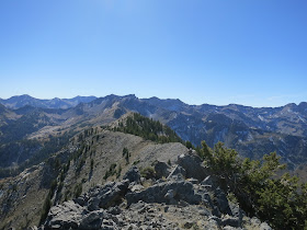 | View south from Kessler's lower north peak, also known as Reed's Peak. The real summit of Kessler Peak is the high point at upper right. The cable of Snowbird's tram is seen in middle left, reflecting sunshine. |